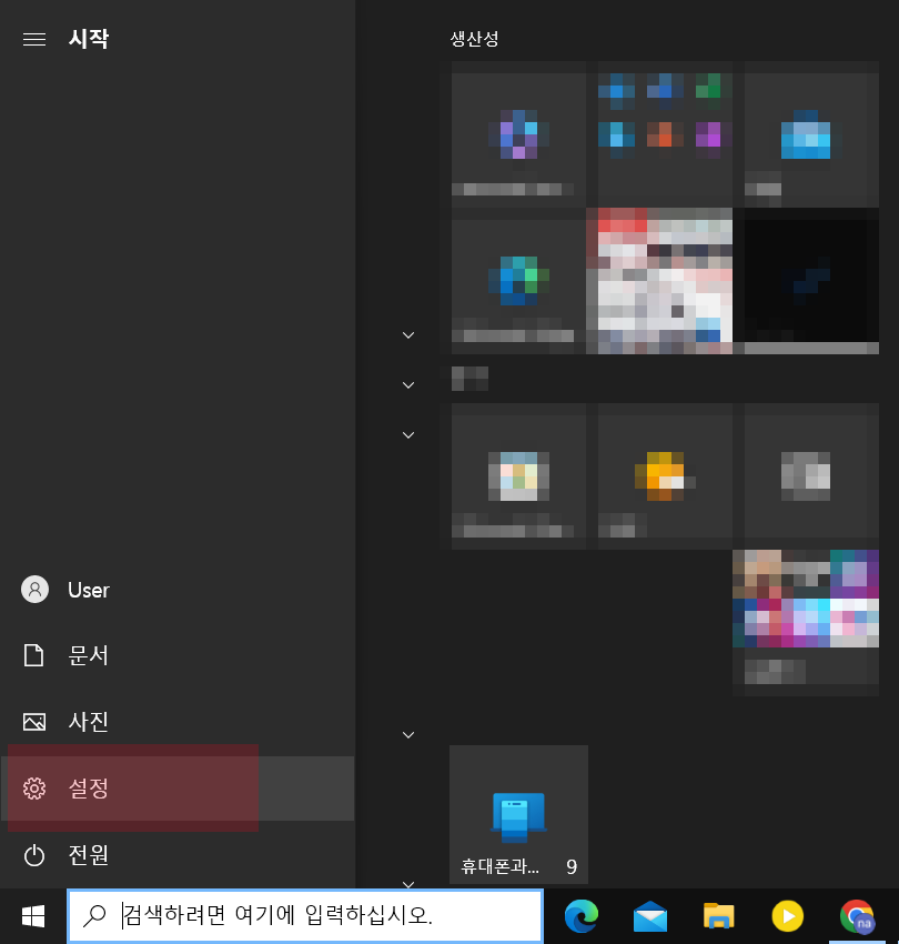 시작메뉴의 톱니바퀴 설정으로 들어갑니다.