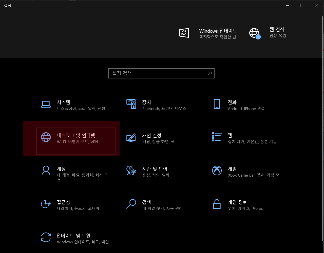 네트워크 및 인터넷을 클릭합니다.