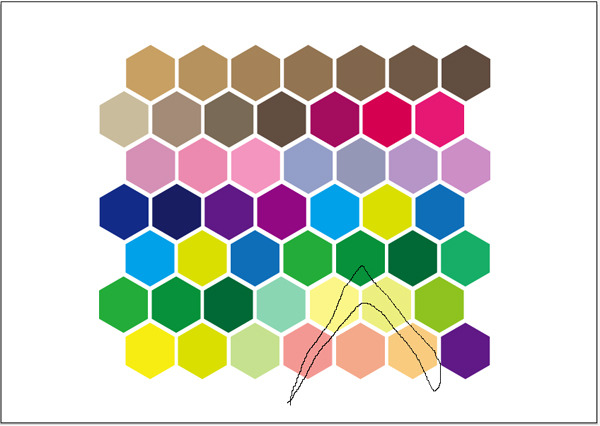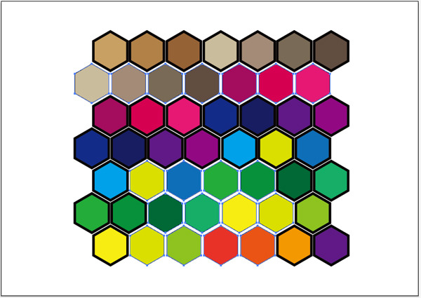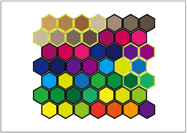 Stroke color (선색상)에 체크 후 마술봉 툴로 클릭한 모습입니다. 선 색상이 옐로 컬러 느낌의 오브젝트들이 선택되었습니다.
