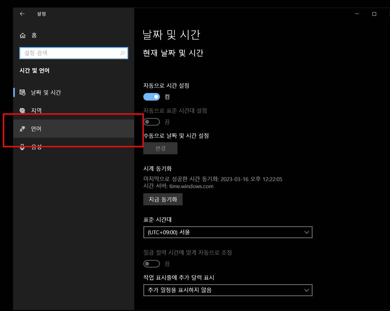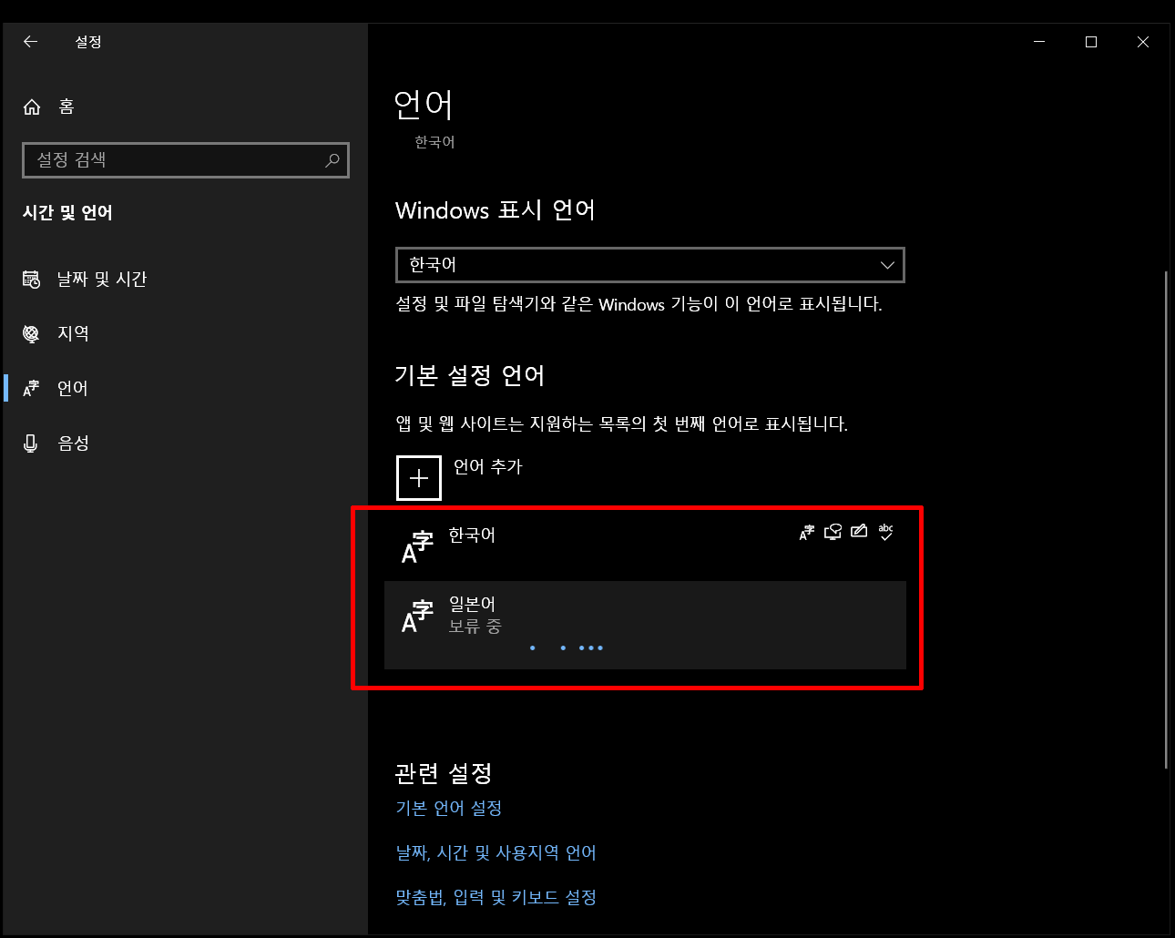 기본 설정언어에서 언어추가를 클릭 합니다.