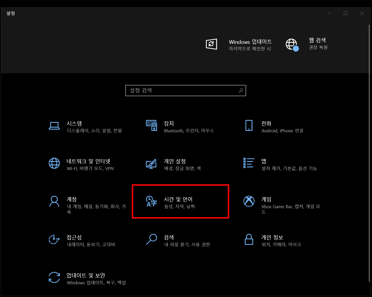 윈도우 로고키 + i 를 눌러 설정으로 들어가 시간 및 언어를 선택 합니다.