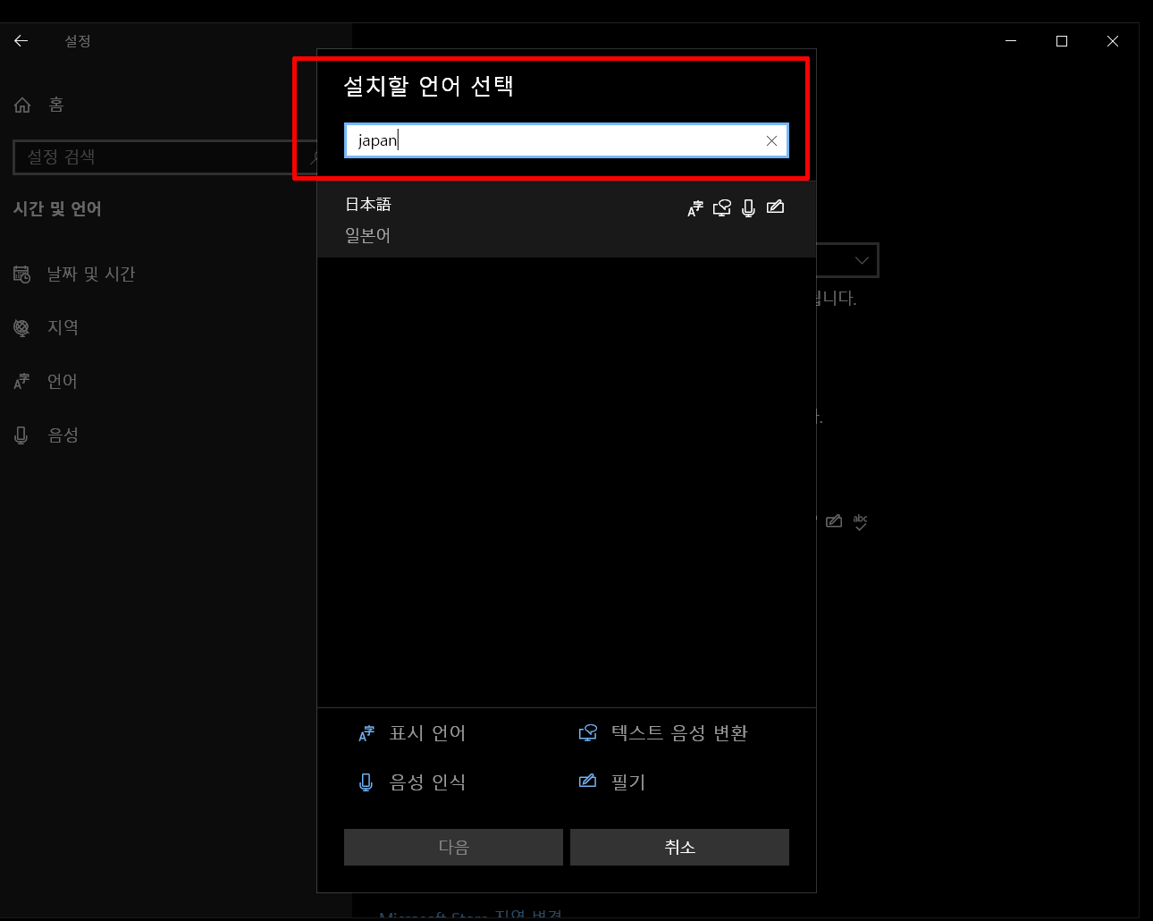언어 기능 설치에서 아래와 같이 체크박스에 체크 합니다.