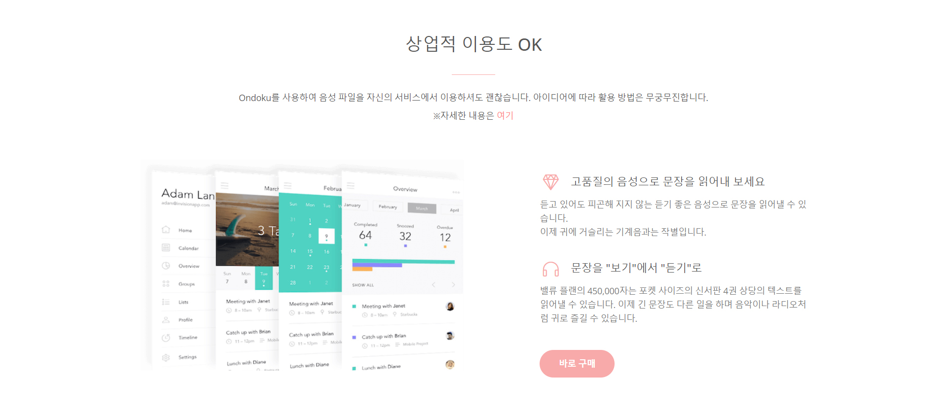 Ondoku 는 텍스트를 음성으로 바꾸어 주는 서비스를 무료로 사용할 수 있습니다. 개인 이용은 물론, 법인 이용 상업적 이용도 가능 합니다. 다만 온도쿠 Ondoku 를 사용 한다는 출처를 표시해야 합니다.