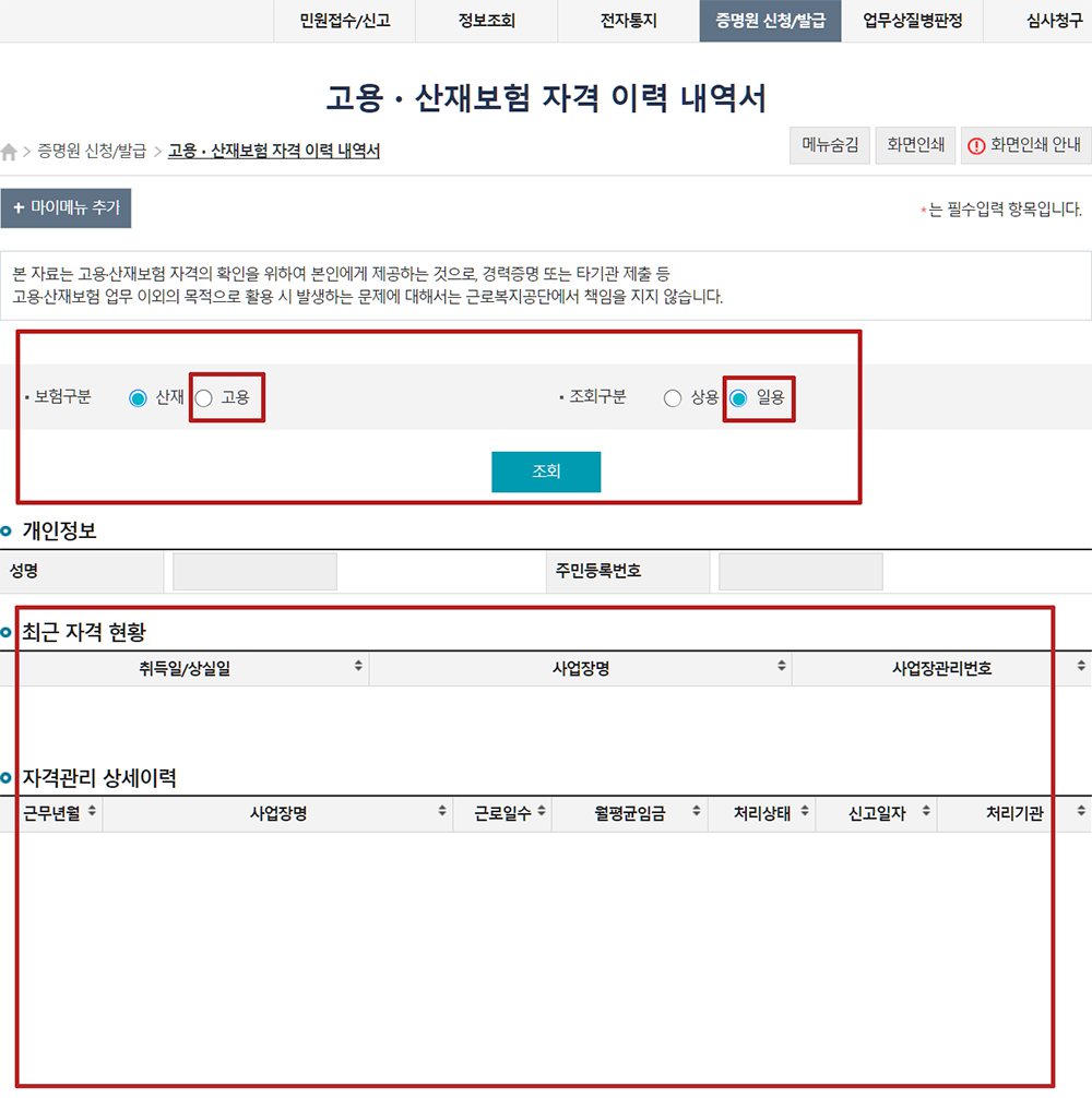 고용,산재보험 자격 이력 내역 조회