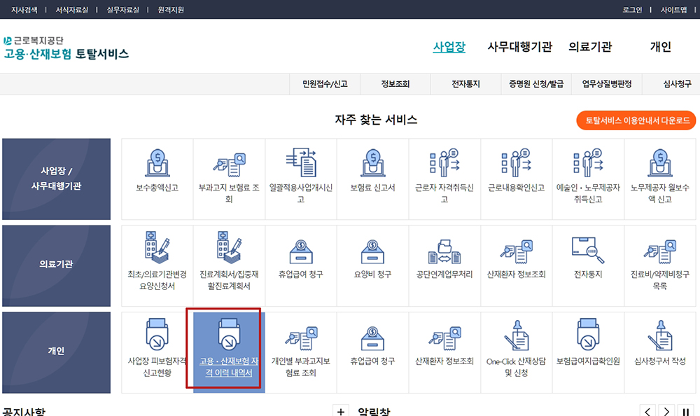 고용, 산재보험 자격 이력 내역서를 클릭합니다.