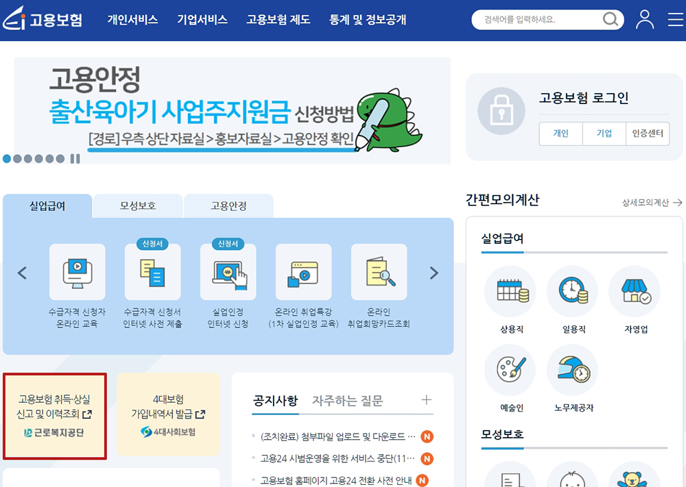 고용보험 홈페이지에 접속 후 고용보험 취득, 상실신고 및 이력조회 클릭합니다.