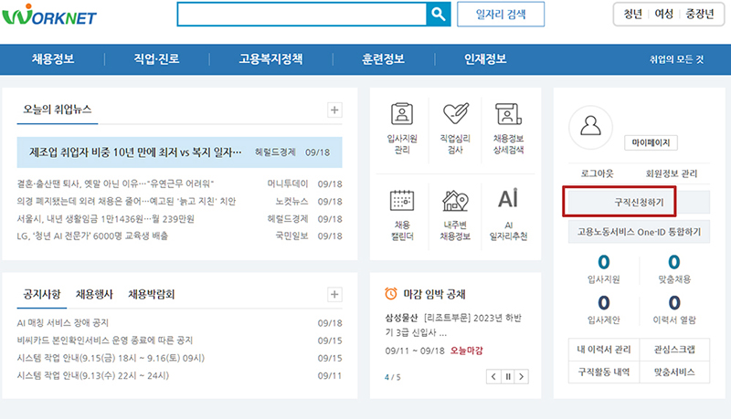 워크넷으로 들어가 회원가입 후 마이페이지 또는 구직신청하기에서 구직등록을 해야 합니다.