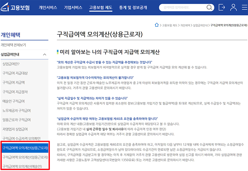 아래는 실업급여 모의계산 링크이며 상용직, 일용직, 예술인 등으로 분류되어 있으니 해당이 되는 내용으로 구직급여 모의계산을 해 보시기 바랍니다.