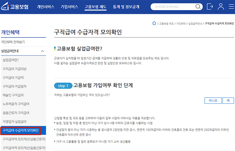 아래 링크는 실업급여를 받기 위해서 가장 먼저 확인해 보아야 하는 실업급여 수급자격이 되는지 테스트하는 링크입니다.