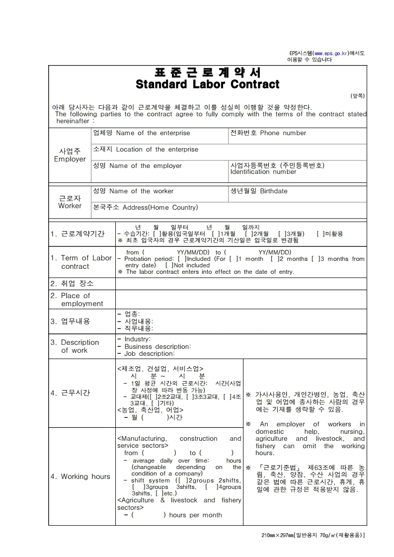 __________(이하 “사업주”라 함)과(와) __________ (이하 “근로자”라 함)은 다음과 같이 근로계약을 체결한다.