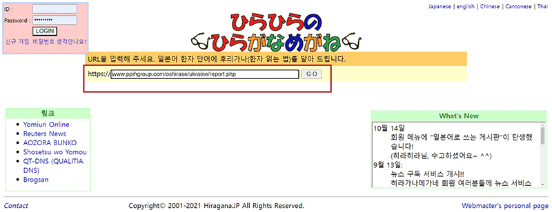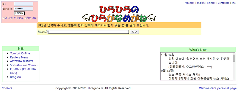 로그인을 하지 않으면 아래처럼 후리가나를 달고자 하는 사이트의 URL을 입력하여 웹페이지의 일본어에 후리가나를 달 수 있습니다.