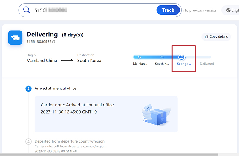 아래와 같이 글로벌 익스프레스 트래킹아래 송장 번호를 클릭해서 들어가면 성동구까지 도착해있습니다.