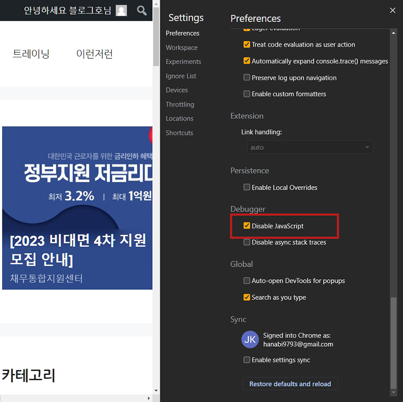 크롬브라우저 페이지 ➞ F12 ➞ 톱니바퀴 클릭 ➞ Preference ➞ 아래로 스크롤 ➞ Disable javaScript 에 체크
