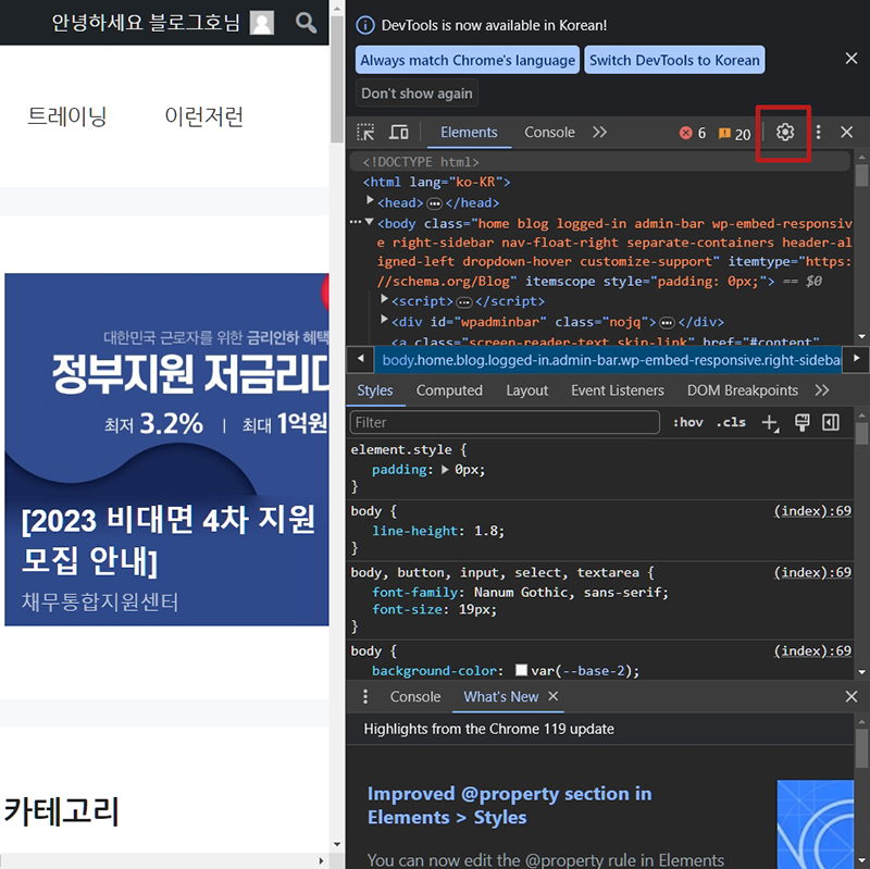 우클릭이나 복사가 되지 않는 페이지에서 키보드의 F12 를 누르면 아래와 같은 창이 나옵니다. 여기에서 상단 톱니바퀴 모양의 설정을 클릭합니다.
