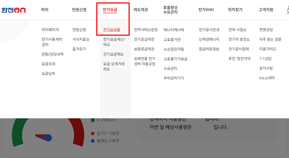 다음은 전기요금표를 보는 방법입니다. 아래와 같이 전기요금표를 클릭합니다.