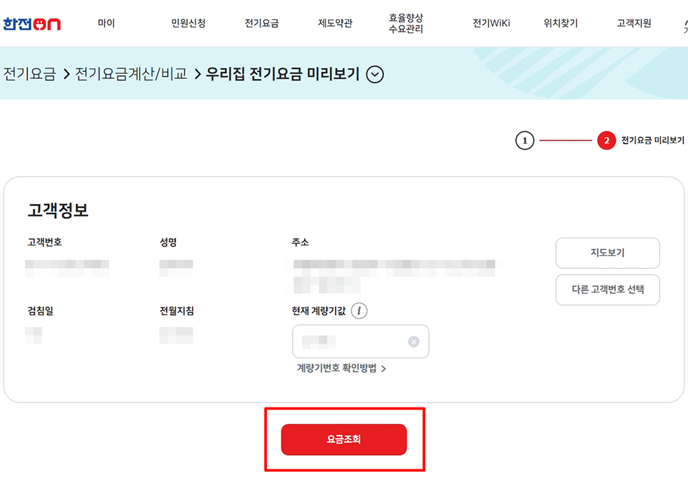 고객정보를 확인하고 요금조회를 클릭합니다.