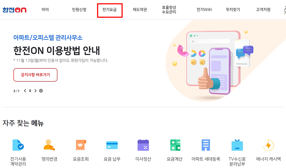 한전 사이버 지점에 한전 ON으로 변경이 된 사이트에 접속하여 로그인을 하고 상단의 전기요금을 클릭합니다.
