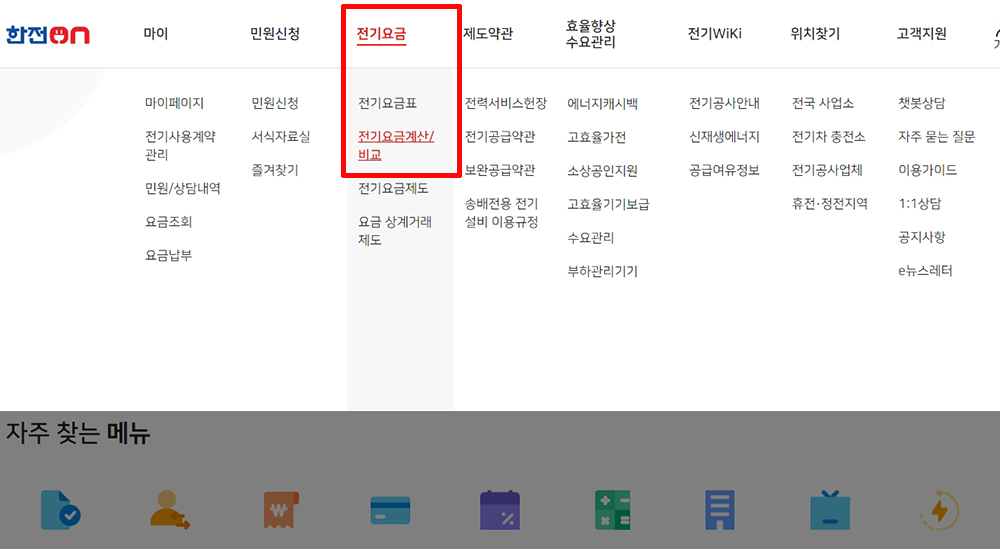 아래와 같이 메뉴 커튼이 펼쳐지면 전기요금계산/비교 를 클릭합니다.