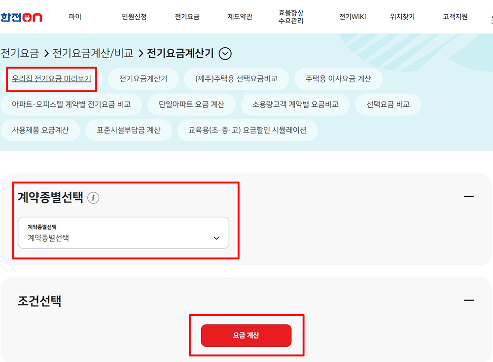 다음은 우리집 전기요금 미리보기 입니다. 아래와 같이 우리집 전기요금 미리보기를 선택하고 주택용 저압, 주택용 고압등 자신에게 해당되는 계약종별을 선택하고 요금계산을 클릭합니다.