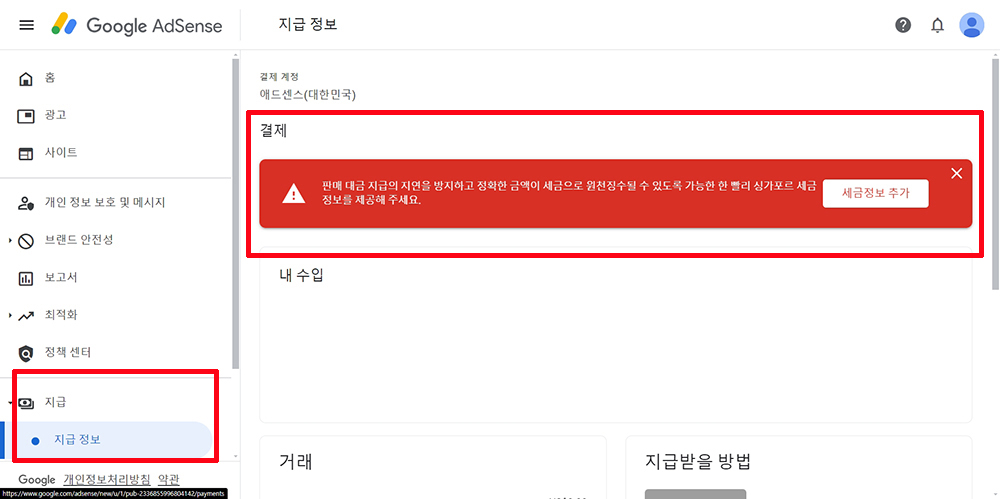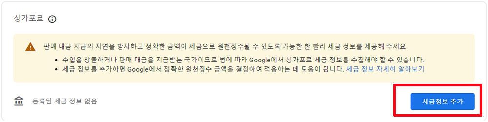 지급정보로 들어가면 이렇게 빨간 창으로 세금정보 추가 창이 보입니다. 세금정보 추가를 클릭합니다.