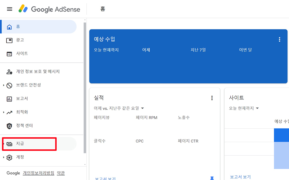 애드센스에 접속하여 우측의 지급을 선택합니다.