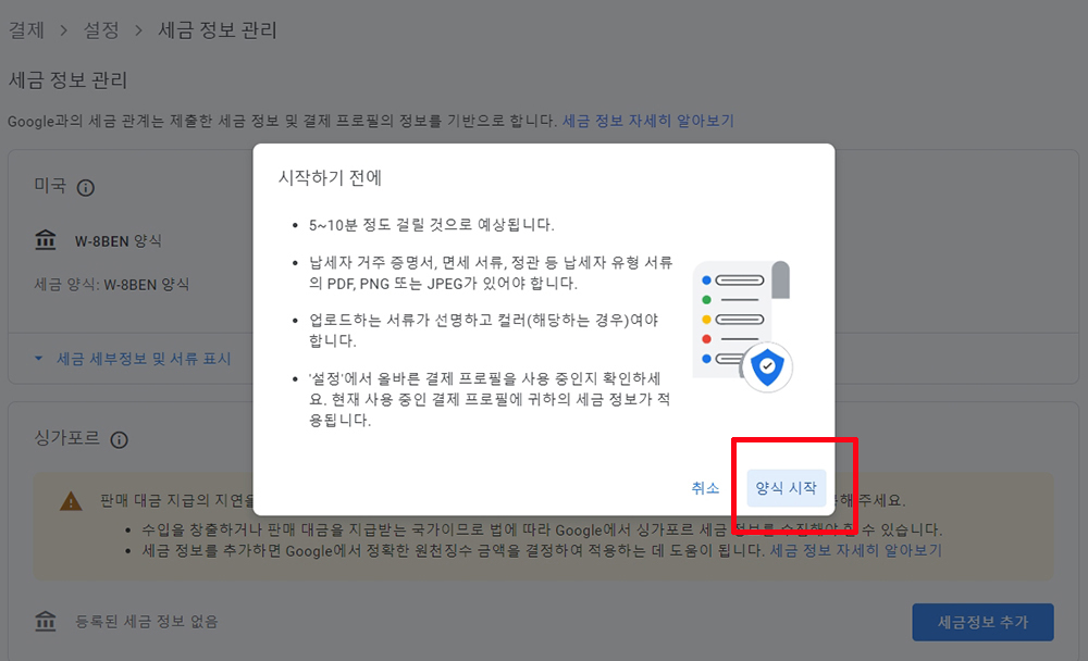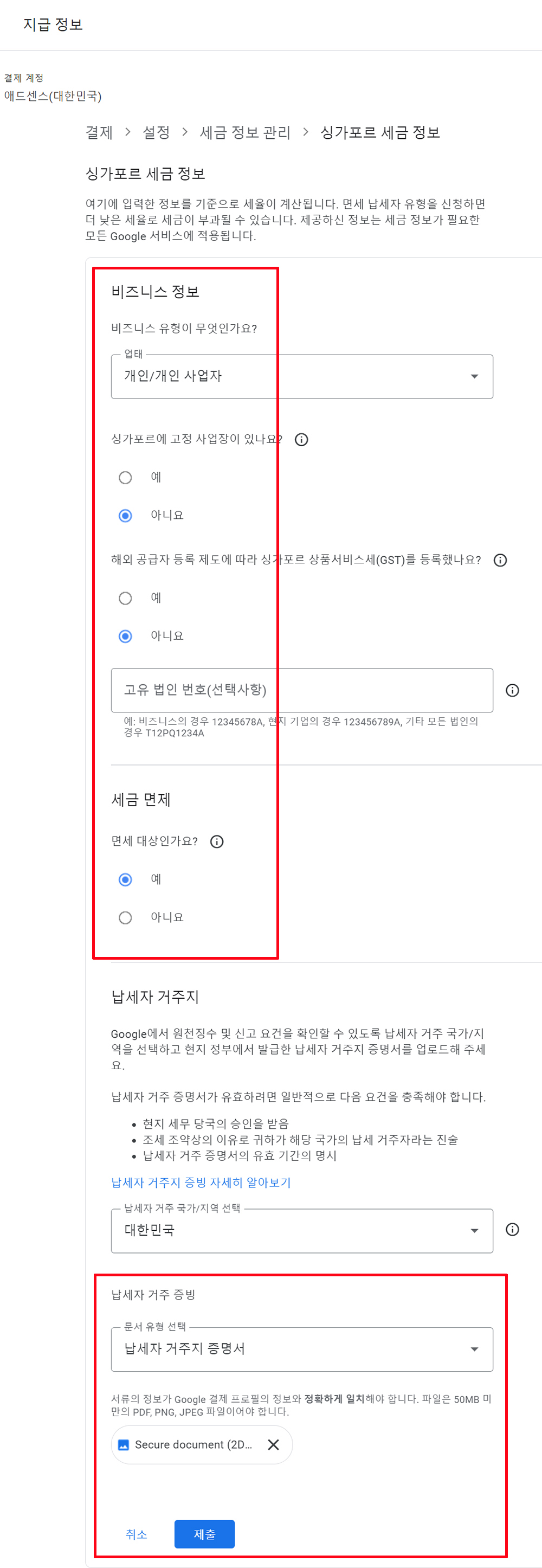 애드센스 싱가포르 세금 정보 추가 및 거주자 증명서 발급 방법