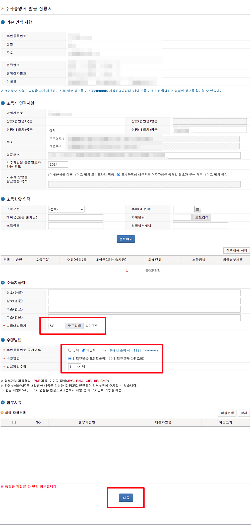 소득현황은 입력하지 말고 그대로 두고, 발급대상 국가를 싱가포르로 선택 후 주민등록번호 공개여부 정하고 수령방법 체크 후 다음을 클릭합니다.