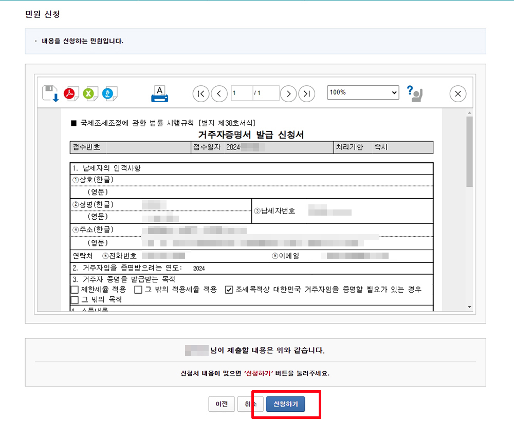 거주자 증명서 발급 신청서를 작성하는데 기본 인적사항과 소득자 인적사항을 확인 후 성명(대표자)영문, 영문주소, 거주자임을 증명받고자하는 연도를 입력합니다.