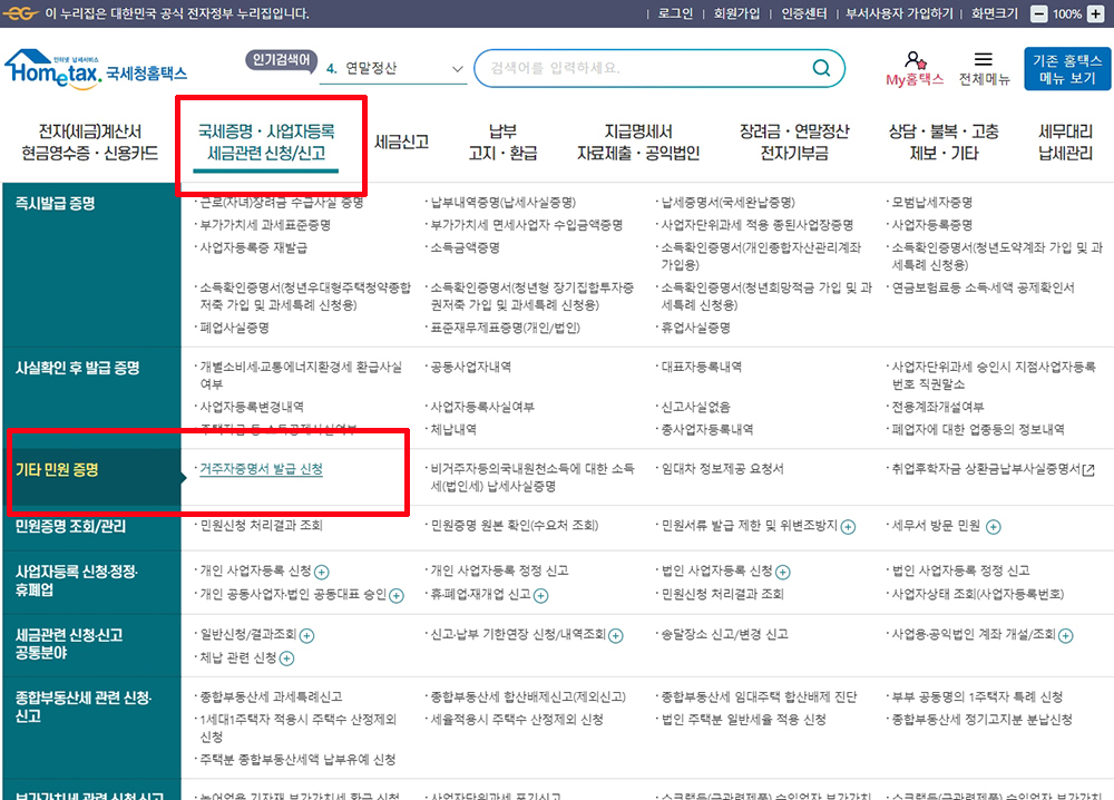 홈택스에 로그인하여 상단의 국세증명,사업자등록 세금관련 신청/신고를 선택합니다.