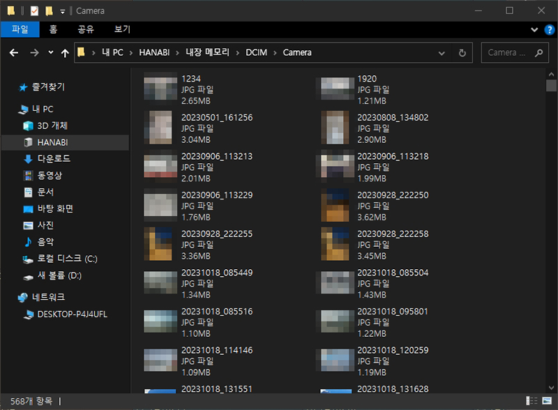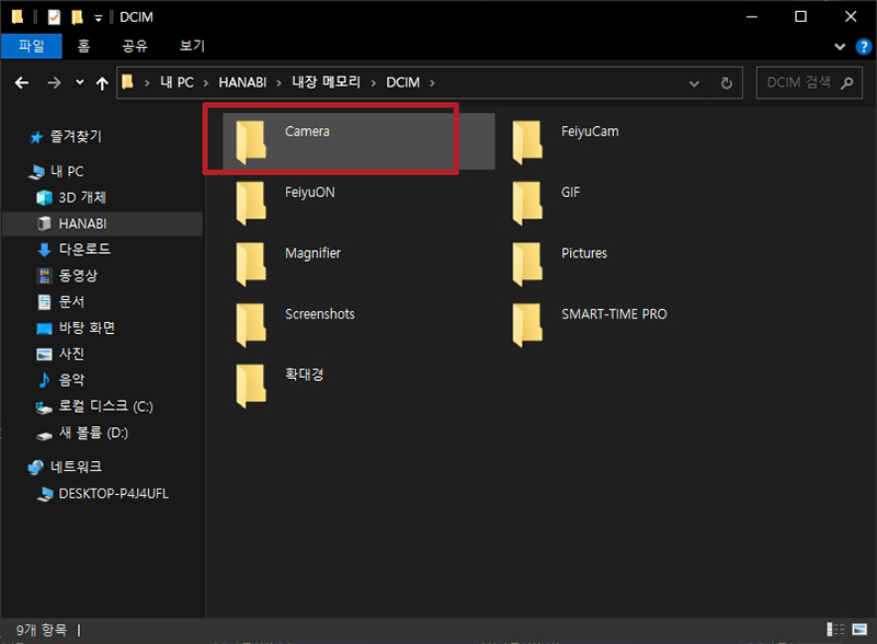 Camera 폴더에 있는 사진을 PC의 원하는 폴더에 드래그하여 옮기면 됩니다.