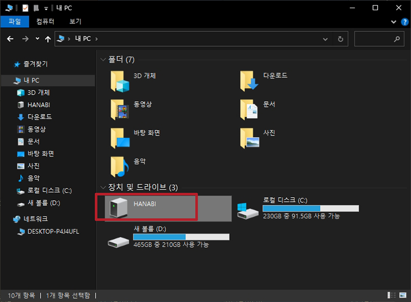 스마트폰과 컴퓨터를 케이블로 연결한 뒤 내 컴퓨터(내 PC)로 들어가 본인의 스마트폰 장치를 클릭합니다.