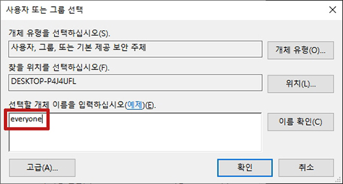 사용자 또는 그룹 선택의 창이 나오면 everyone 이라고 이름을 정합니다.