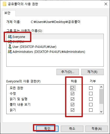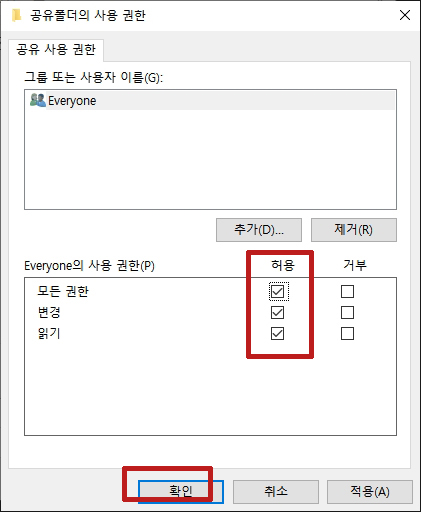 모든 권한, 변경, 읽기에 체크합니다.