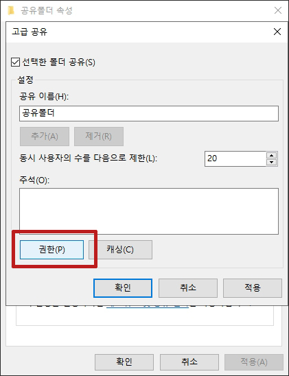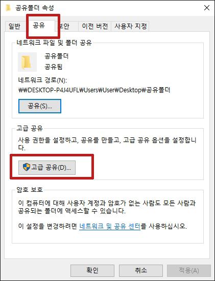 공유폴더 속성의 공유로 들어가서 고급공유를 클릭합니다.