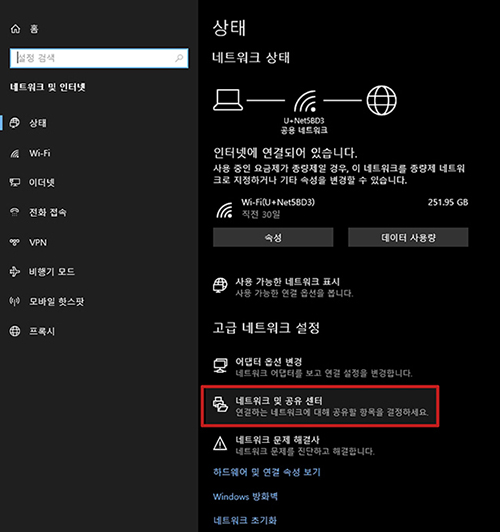 다음은 내트워크 및 공유센터를 클릭합니다.