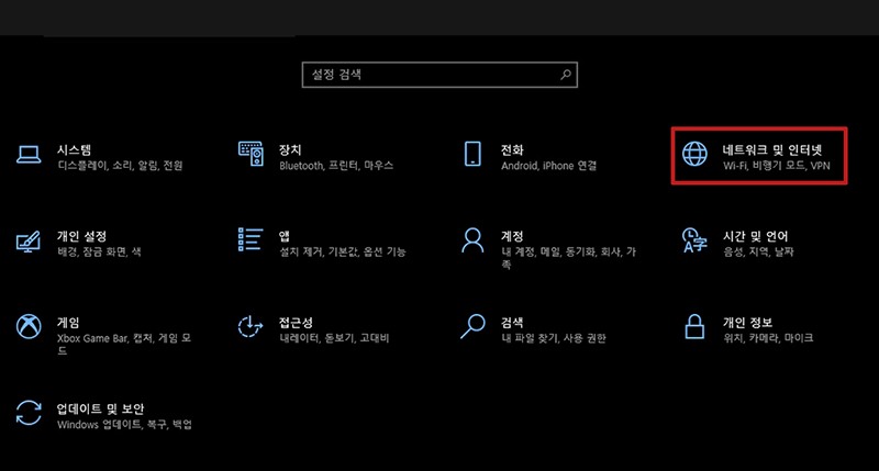네트워크 및 인터넷을 클릭합니다.