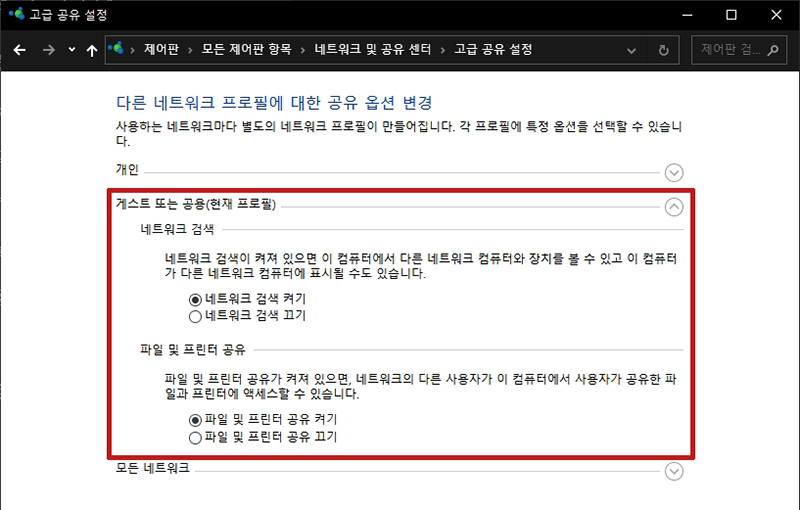 다음은 게스트 또는 공용을 펼치고 네트원크 검색 켜기에 체크하고 파일 및 프린터 공유 켜기에 체크합니다.
