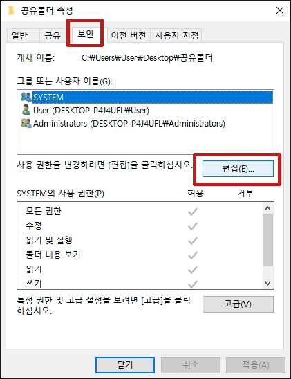 공유폴더의 보안으로 들어가 편집을 클릭합니다.