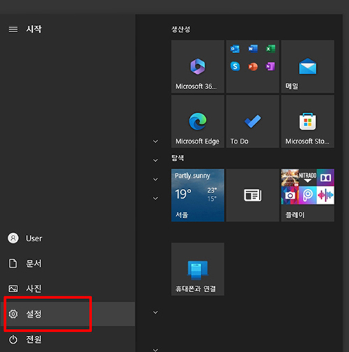 시작메뉴에서 톱니바퀴모양 설정을 클릭합니다.