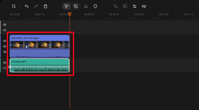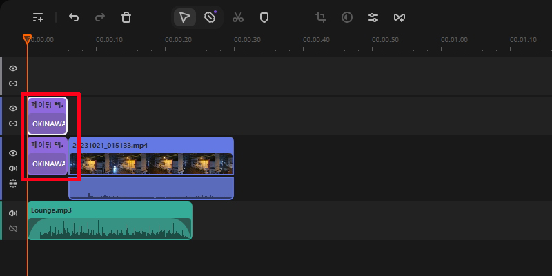 텍스트 바는 드래그 드랍하여 영상 바의 위로 끌어 올리면 됩니다. 저는 앞,뒤로 자리를 잡아 보았습니다.