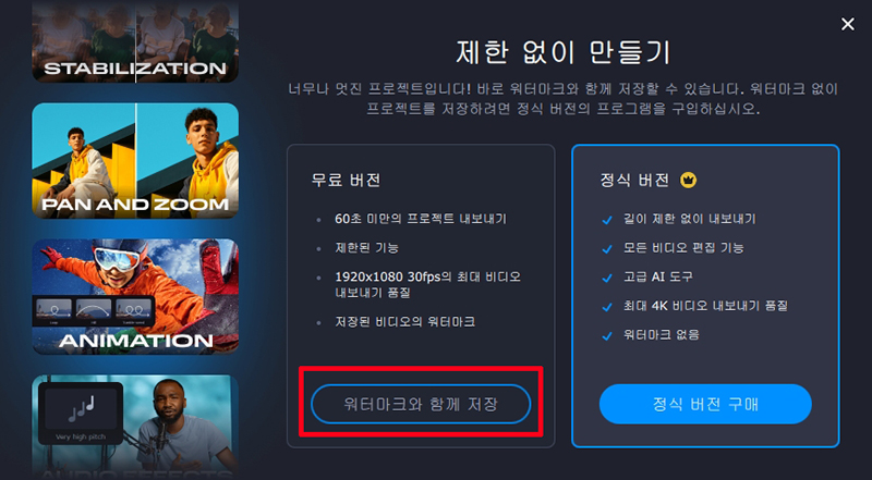 무료 버전은 아래와 같은 조건이 있습니다. 무료 버전은 워터마크와 함께 저장을 클릭합니다.