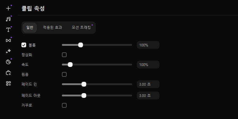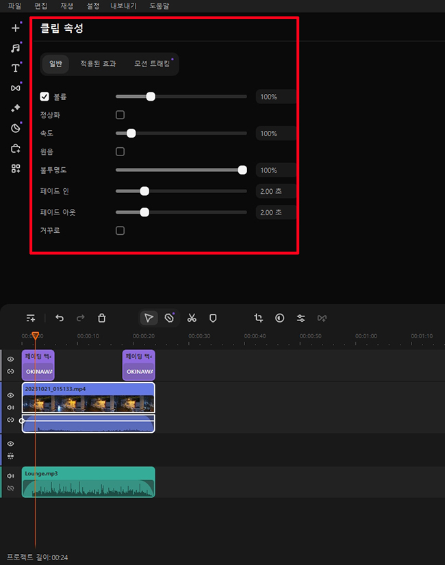 클립 속성에서 볼륨, 속도 등 간단한 영상 편집을 할 수 있습니다. 저는 페이드인, 페이드아웃 효과를 넣어 보았습니다.