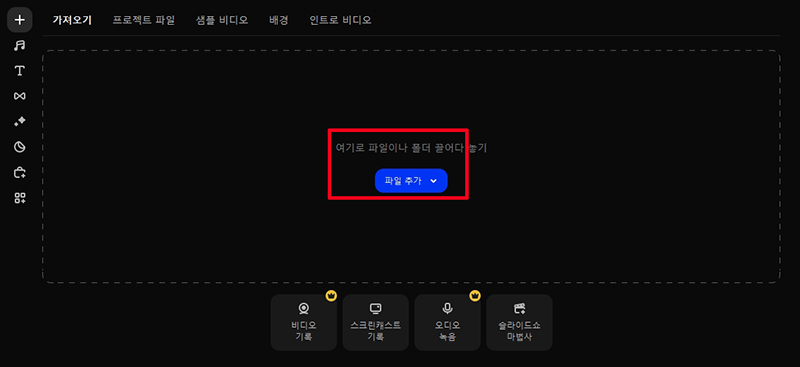 영상 편집프로그램이 실행되면 파일추가를 클릭하여 편집할 동영상을 불러옵니다.