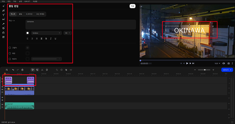 텍스트 편집은 보라색 바를 우클릭 하여 편집으로 들어가면 내용,글꼴,색상등을 편집할 수 있습니다. 이런 식으로 저는 오프닝과 엔딩을 OKINAWA로 편집했습니다.