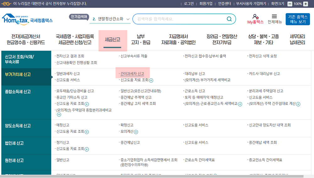 국세청 홈택스에 접속 및 로그인하여 세금신고를 선택합니다.