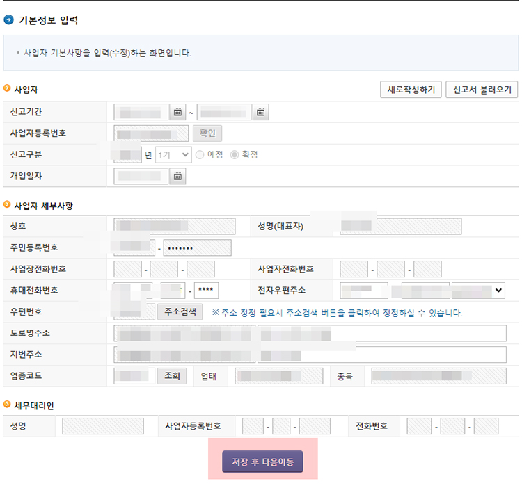 기본정보는 작성이 되어서 나오는 것이 일반적입니다. 틀린 부분은 없는지 확인하고 저장 후 다음이 동을 클릭합니다.