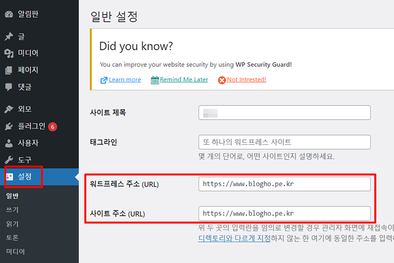 설정으로 들어가면 워드 프레스 주소와 사이트 주소 두 가지가 있으며 내용은 cafe24가 포함된 주소가 입력되어 있습니다.