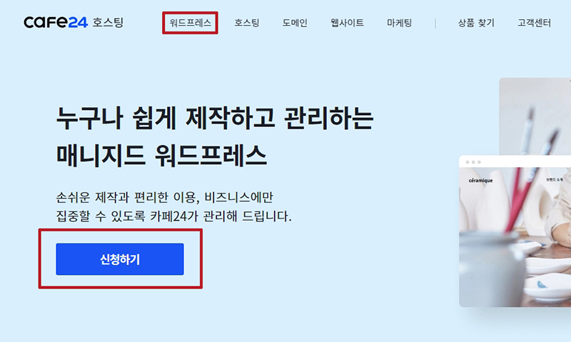 카페24 홈페이지에 접속하여 워드프레스 신청하기로 들어가 웹호스팅을 신청합니다.