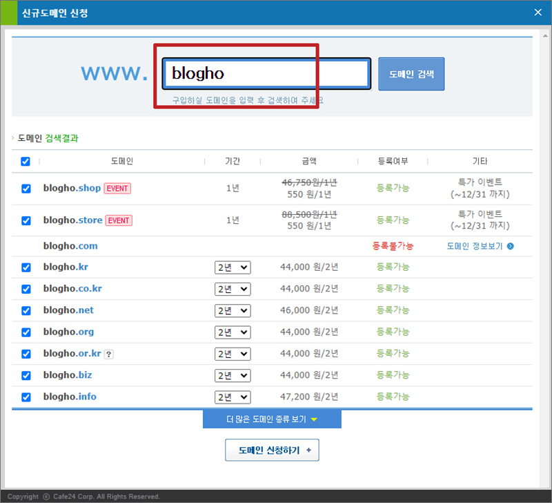 이제 도메인을 구매합니다. 다른 곳에서 구매한 보유 도메인이 있다면 나중에 도메인 이전을 하면되고 신규라면 신규 도메인 등록을 선택하고 생각해 두었던 도메인을 검색하여 선택하고 결재합니다.