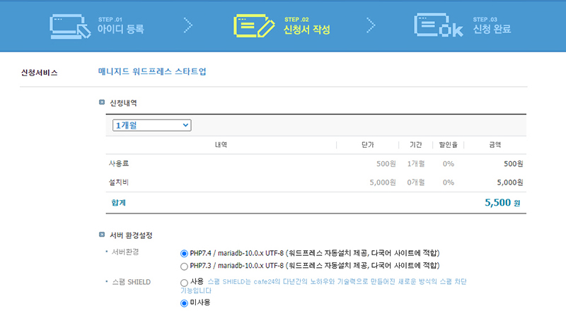 매니지드 워드프레스 스타트업 구매 신청서를 작성합니다. 우선 가장 저렴한 가격의 호스팅을 신청하고 이후 사용량이 많아지면 용량을 업그레이드하면 됩니다.